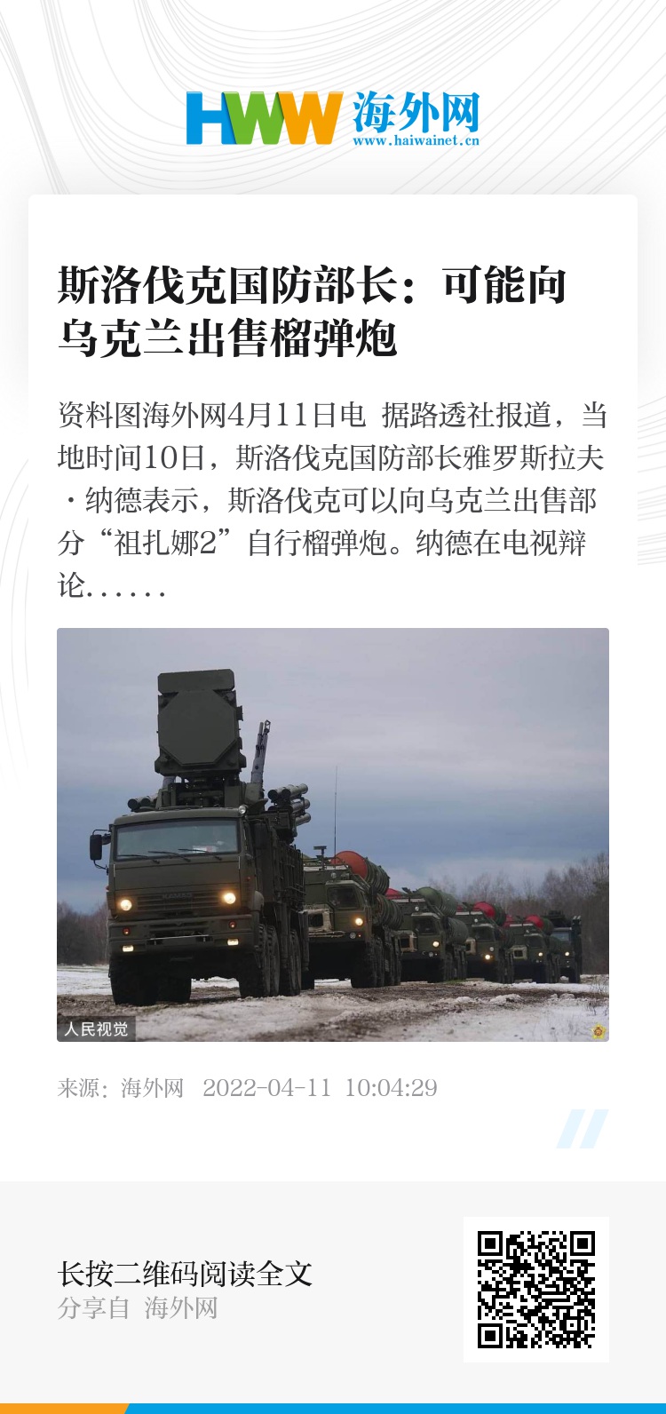 海外网4月11日电 据路透社报道,当地时间10日,斯洛伐克国防部长雅罗斯拉夫·纳德表示,斯洛伐克可以向乌克兰出售部分“祖扎娜2”自行榴弹炮。纳德在电视辩论中说:“我可以确认我们正就出售进行谈判。”