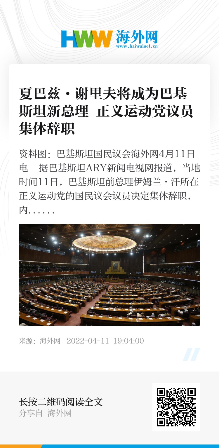 海外网4月11日电 据巴基斯坦ARY新闻电视网报道,当地时间11日,巴基斯坦前总理伊姆兰·汗所在正义运动党的国民议会议员决定集体辞职,内政部长谢赫·拉希德确认了该决定。