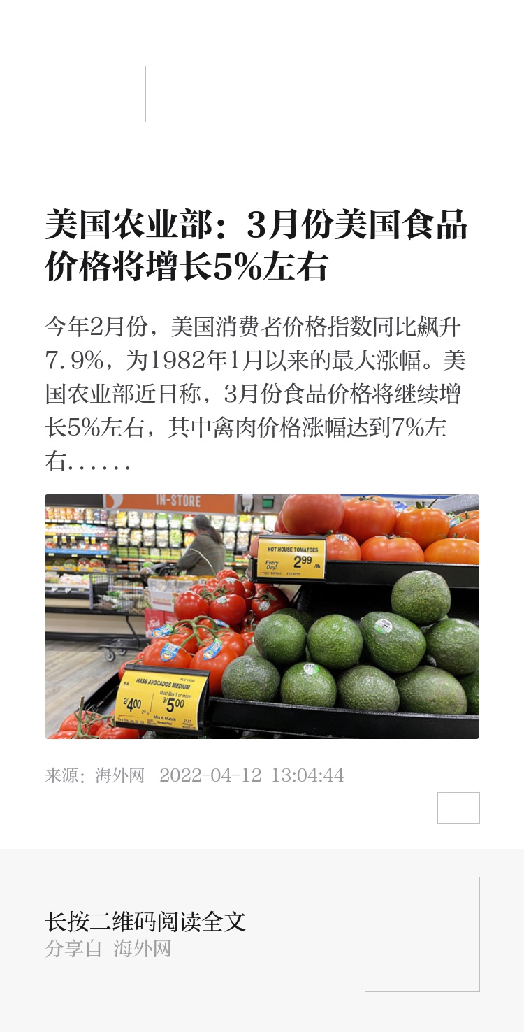 今年2月份,美国消费者价格指数同比飙升7.9%,为1982年1月以来的最大涨幅。美国农业部近日称,3月份食品价格将继续增长5%左右,其中禽肉价格涨幅达到7%左右,水果价格涨幅将在5%到6%之间。图片来源:视觉中国