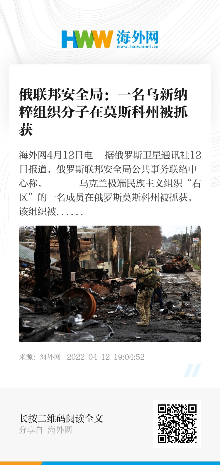 海外网4月12日电 据俄罗斯卫星通讯社12日报道,俄罗斯联邦安全局公共事务联络中心称, 乌克兰极端民族主义组织“右区”的一名成员在俄罗斯莫斯科州被抓获,该组织被俄罗斯认定为新纳粹主义政党。被捕人员出生于莫斯科,2017-2019年在乌军服役,且接受了北约的破坏活动训练。