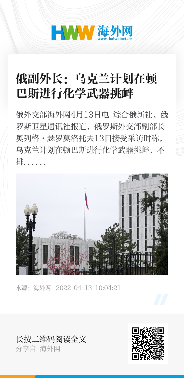 海外网4月13日电 综合俄新社、俄罗斯卫星通讯社报道,俄罗斯外交部副部长奥列格·瑟罗莫洛托夫13日接受采访时称,乌克兰计划在顿巴斯进行化学武器挑衅,不排除使用有毒物质攻击目标的可能性。