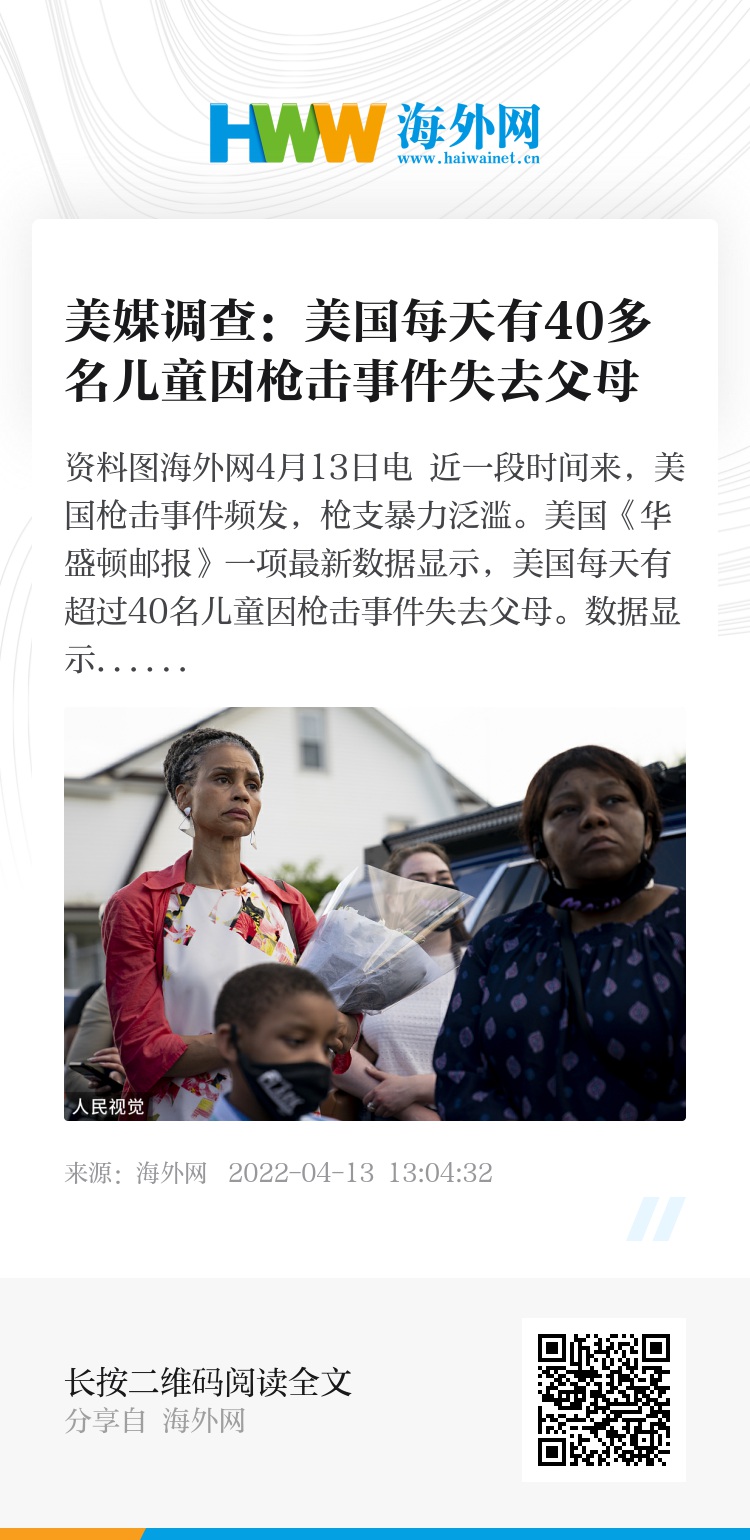 海外网4月13日电 近一段时间来,美国枪击事件频发,枪支暴力泛滥。美国《华盛顿邮报》一项最新数据显示,美国每天有超过40名儿童因枪击事件失去父母。
