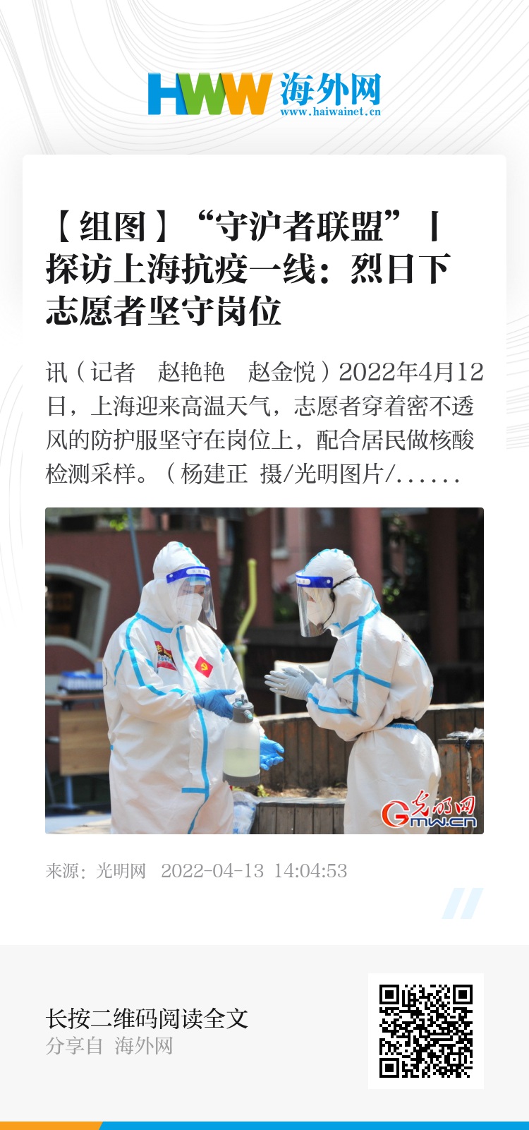 2022年4月12日,上海迎来高温天气,志愿者穿着密不透风的防护服坚守在岗位上,配合居民做核酸检测采样。(杨建正 摄/光明图片/视觉中国)