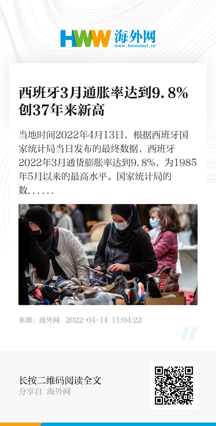 当地时间2022年4月13日,根据西班牙国家统计局当日发布的最终数据,西班牙2022年3月通货膨胀率达到9.8%,为1985年5月以来的最高水平。国家统计局的数据显示,俄乌冲突进一步加剧了西班牙的能源和食品等物价的上涨,其中能源价格上涨对通货膨胀的推动最为明显。图片来源:视觉中国