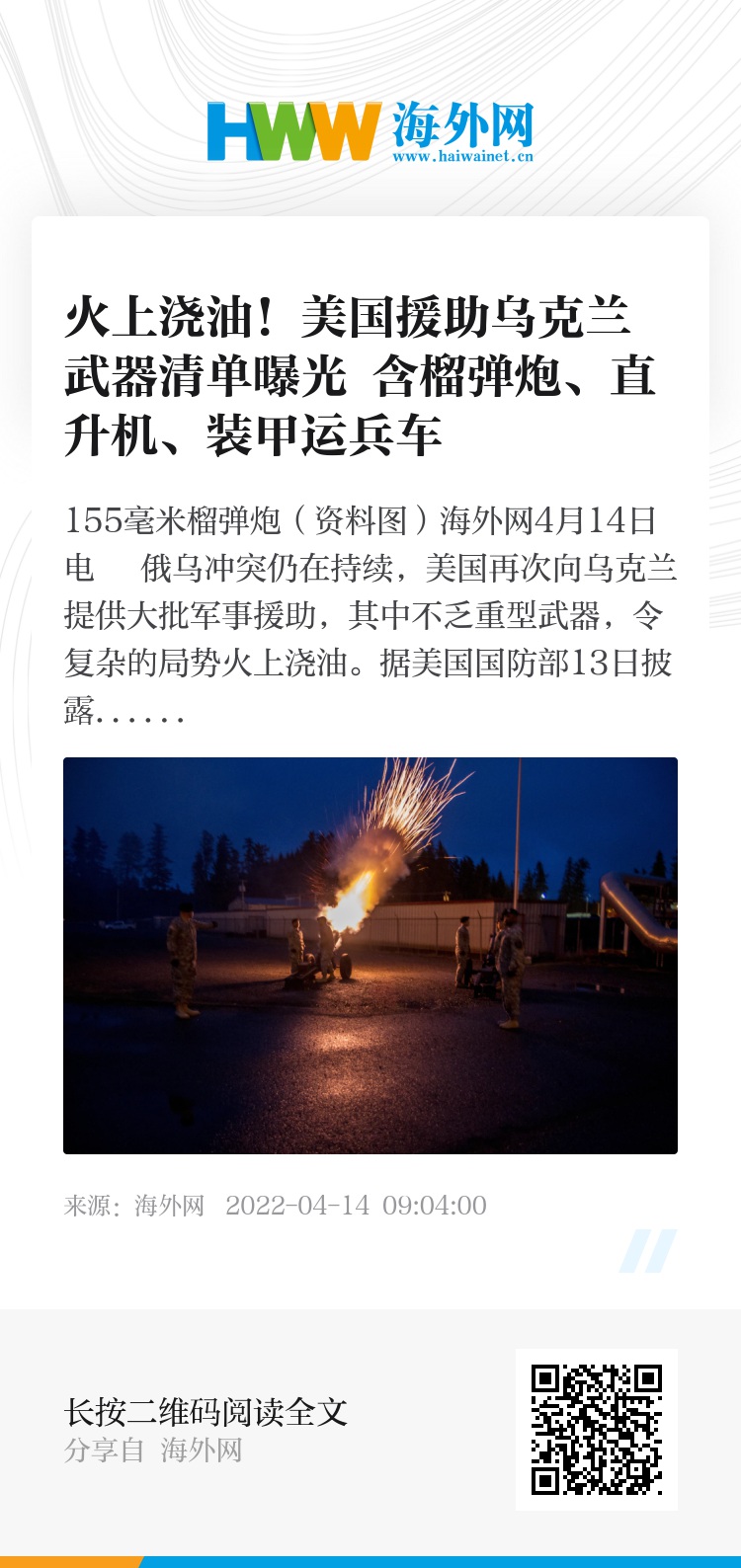 海外网4月14日电 俄乌冲突仍在持续,美国再次向乌克兰提供大批军事援助,其中不乏重型武器,令复杂的局势火上浇油。据美国国防部13日披露,美国政府已批准向乌克兰提供8亿美元的额外军事援助,包括155毫米榴弹炮以及米-17直升机等。