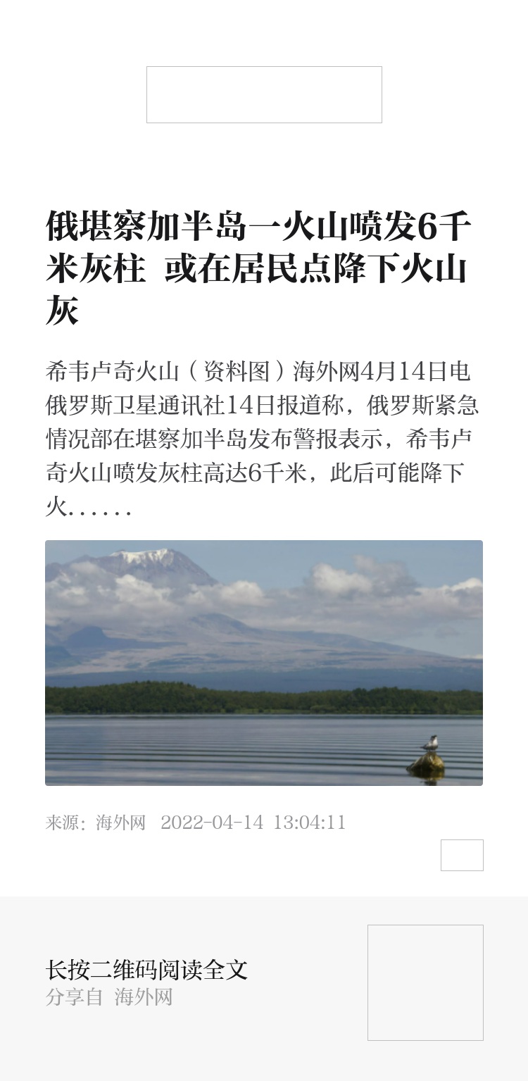 海外网4月14日电 俄罗斯卫星通讯社14日报道称,俄罗斯紧急情况部在堪察加半岛发布警报表示,希韦卢奇火山喷发灰柱高达6千米,此后可能降下火山灰。