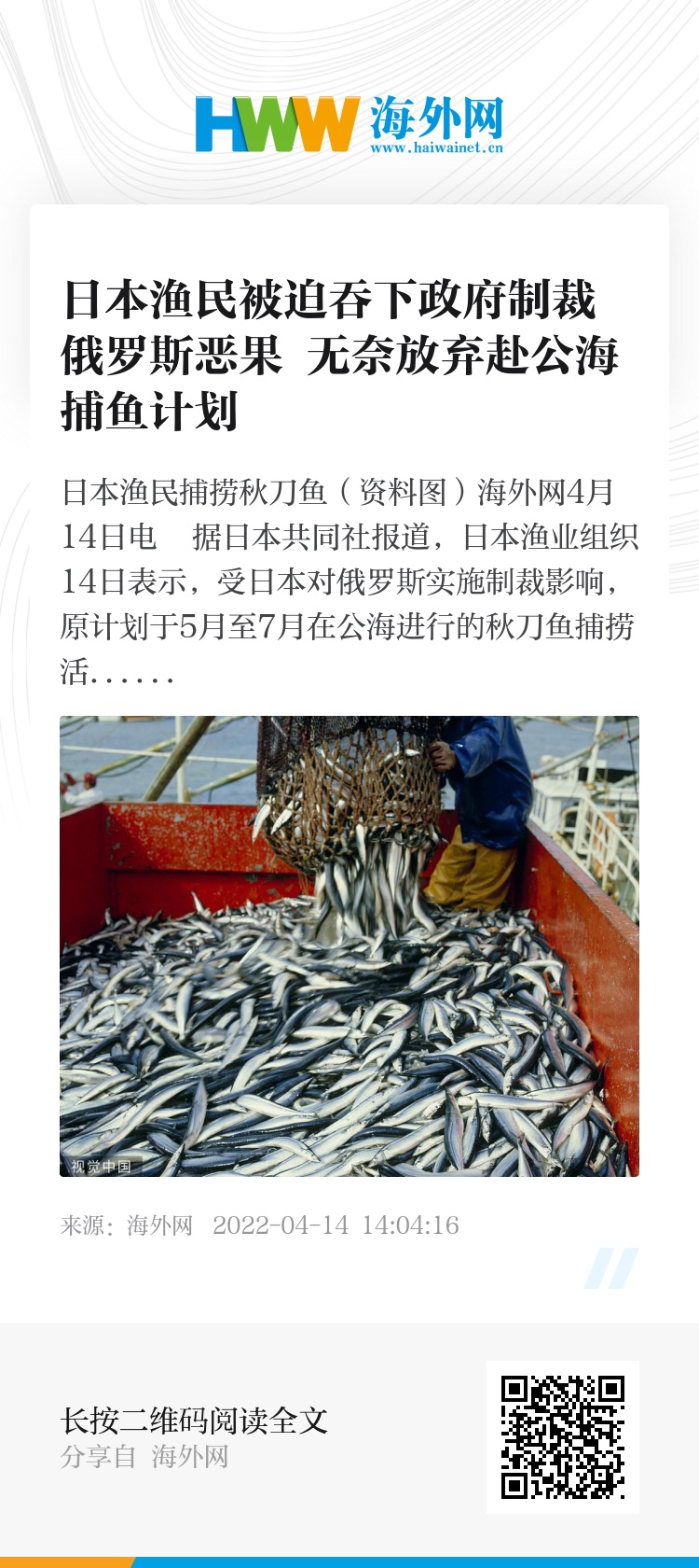 海外网4月14日电 据日本共同社报道,日本渔业组织14日表示,受日本对俄罗斯实施制裁影响,原计划于5月至7月在公海进行的秋刀鱼捕捞活动将被迫搁置。