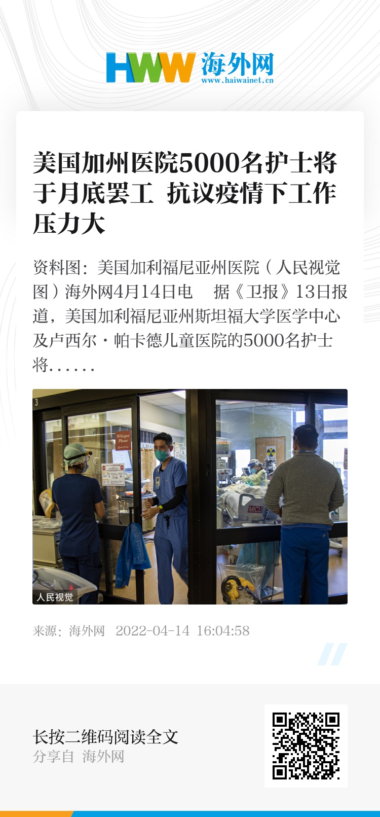 海外网4月14日电 据《卫报》13日报道,美国加利福尼亚州斯坦福大学医学中心及卢西尔·帕卡德儿童医院的5000名护士将于4月25日举行罢工,抗议新冠疫情以来剧增的工作压力,要求提高工资、给予心理健康支持和更好的福利待遇。