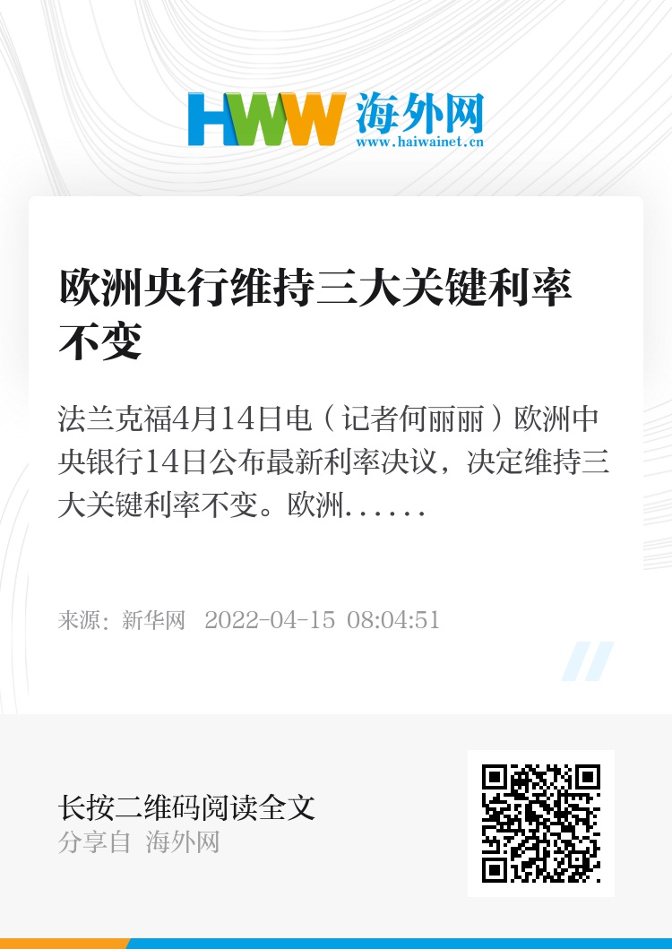 新华社法兰克福4月14日电(记者何丽丽)欧洲中央银行14日公布最新利率决议,决定维持三大关键利率不变。