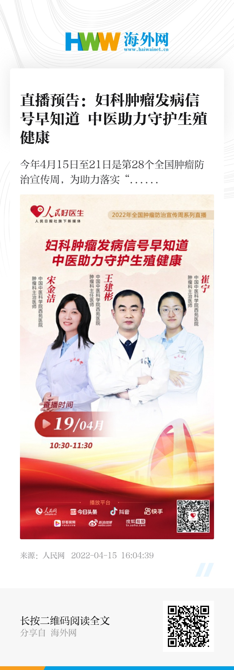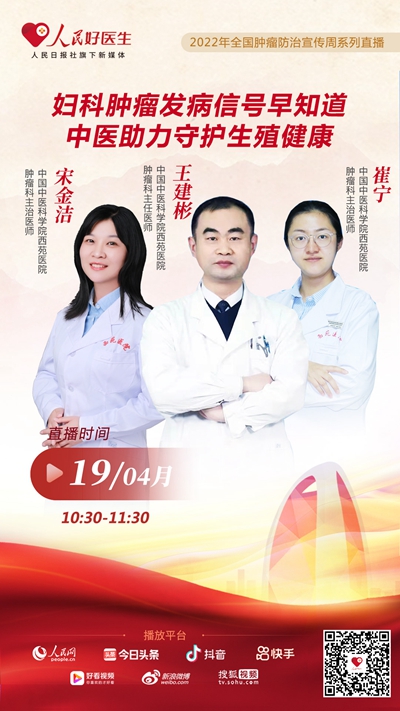 4月19日10:30至11:30,客户端将邀请到中国中医科学院西苑医院肿瘤科主任医师王建彬、中国中医科学院西苑医院肿瘤科主治医师宋金洁、中国中医科学院西苑医院肿瘤科主治医师崔宁做客直播间,为大家详细讲解妇科肿瘤防治知识。