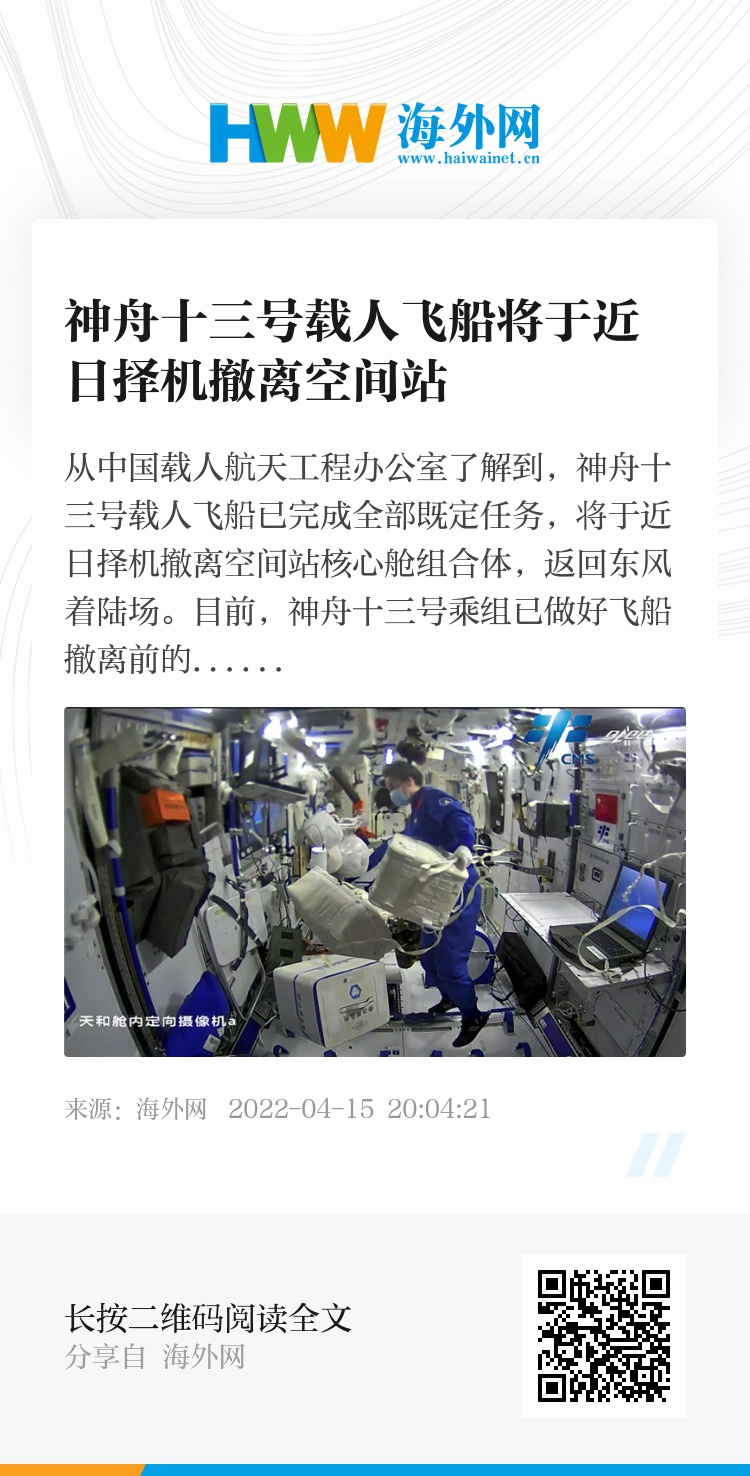 从中国载人航天工程办公室了解到,神舟十三号载人飞船已完成全部既定任务,将于近日择机撤离空间站核心舱组合体,返回东风着陆场。目前,神舟十三号乘组已做好飞船撤离前的各项准备,东风着陆场及工程相关系统正在开展迎接航天员返回的各项准备。(图:视觉中国)