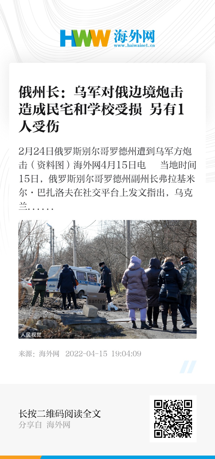 海外网4月15日电 当地时间15日,俄罗斯别尔哥罗德州副州长弗拉基米尔·巴扎洛夫在社交平台上发文指出,乌克兰昨日(14日)向俄乌边境发起炮击,当地一处村庄的20余栋房屋和1所学校遭到破坏。