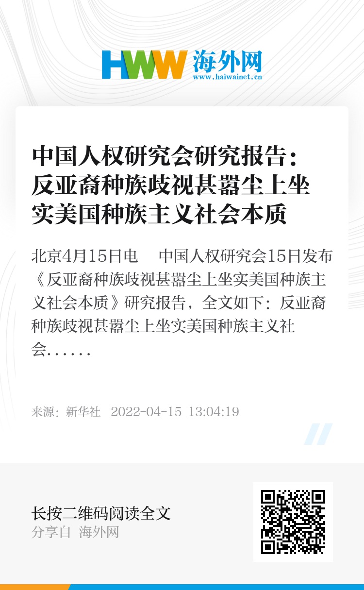 新华社北京4月15日电 中国人权研究会15日发布《反亚裔种族歧视甚嚣尘上坐实美国种族主义社会本质》研究报告,全文如下: