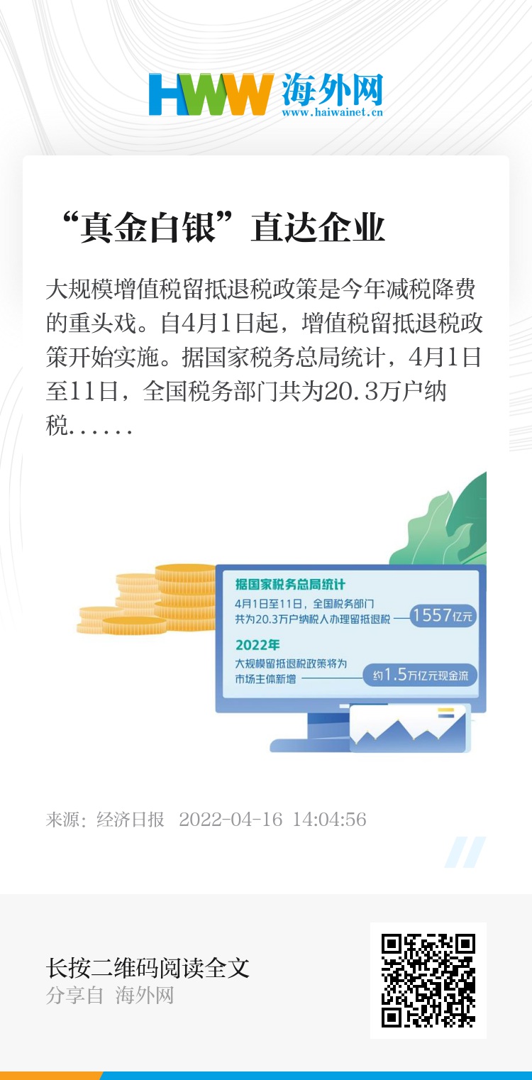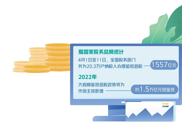大规模增值税留抵退税政策是今年减税降费的重头戏。自4月1日起,增值税留抵退税政策开始实施。据国家税务总局统计,4月1日至11日,全国税务部门共为20.3万户纳税人办理留抵退税1557亿元。
