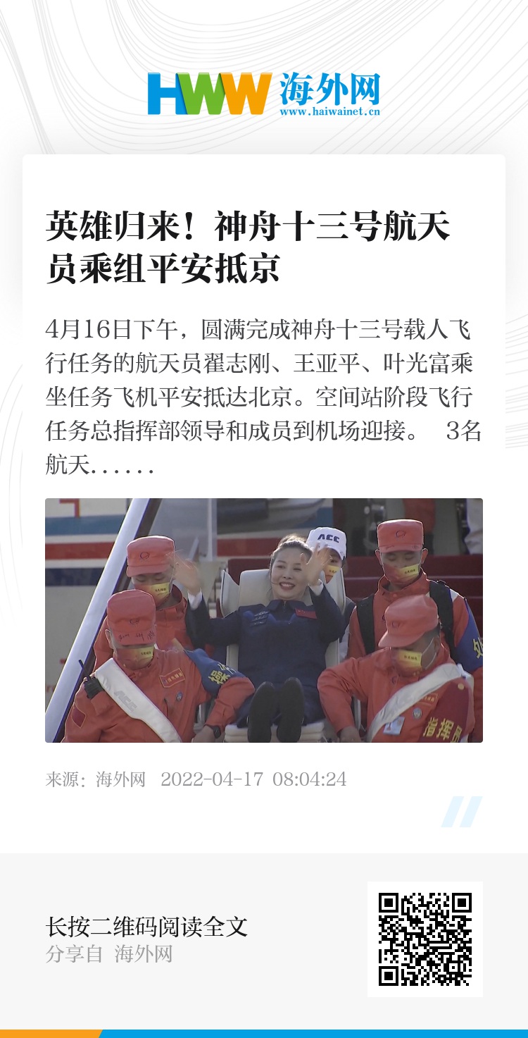 4月16日下午,圆满完成神舟十三号载人飞行任务的航天员翟志刚、王亚平、叶光富乘坐任务飞机平安抵达北京。空间站阶段飞行任务总指挥部领导和成员到机场迎接。 3名航天员抵京后将进入医学隔离期,进行全面的医学检查和健康评估,并安排休养。