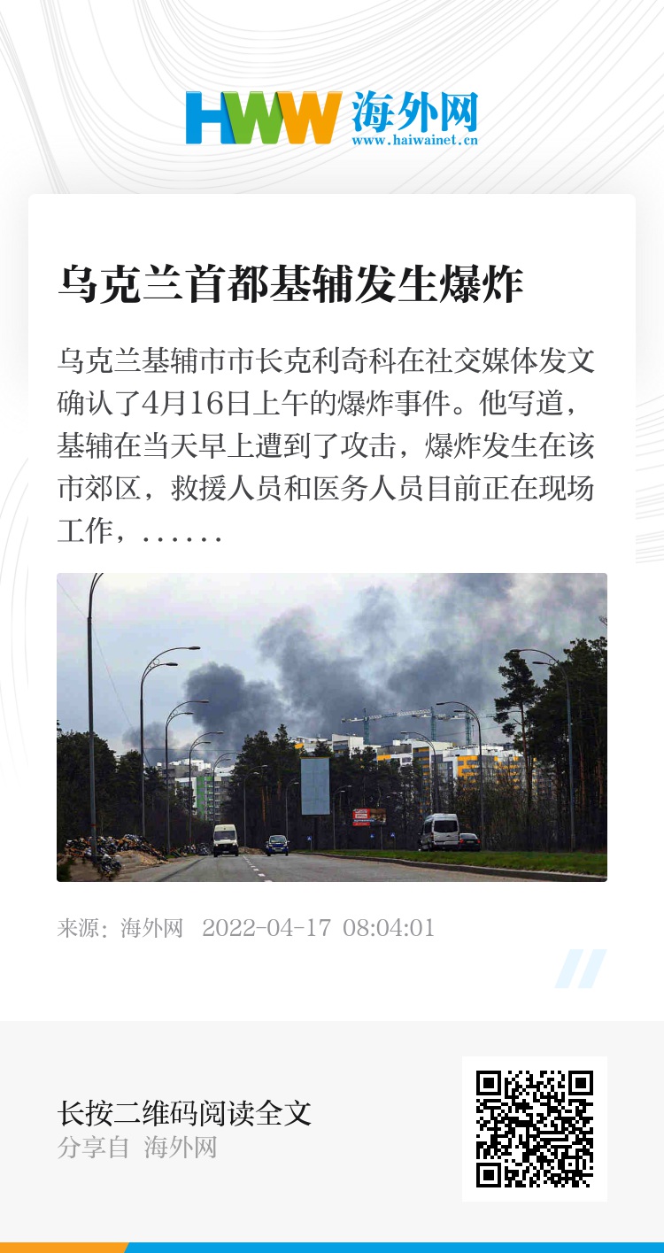 乌克兰基辅市市长克利奇科在社交媒体发文确认了4月16日上午的爆炸事件。他写道,基辅在当天早上遭到了攻击,爆炸发生在该市郊区,救援人员和医务人员目前正在现场工作,关于受损的数据正在调查中。他敦促基辅居民不要返回该市,而是留在更安全的地方。图为16日乌克兰基辅达尔尼茨基区上空升起浓烟。图片来源:人民视觉