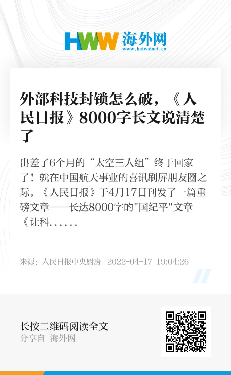 出差了6个月的“太空三人组”终于回家了!就在中国航天事业的喜讯刷屏朋友圈之际,《人民日报》于4月17日刊发了一篇重磅文章——长达8000字的"国纪平"文章《让科技创新为人类文明进步提供不竭动力》。