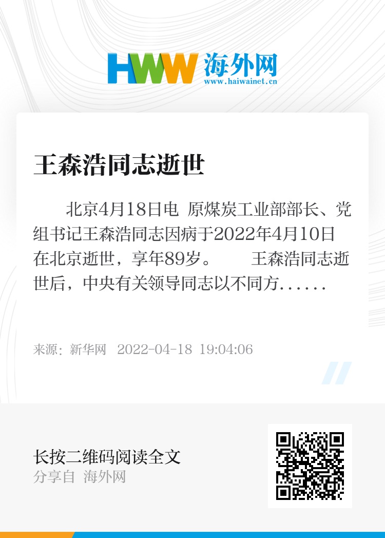 新华社北京4月18日电 原煤炭工业部部长、党组书记王森浩同志因病于2022年4月10日在北京逝世,享年89岁。