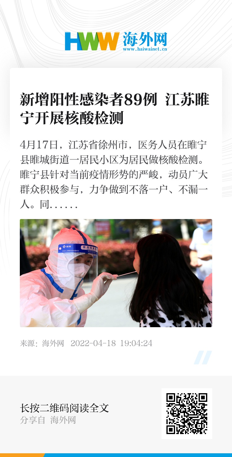 32393986,.新增阳性感染者89例 江苏睢宁开展核酸检测,.2022-04-18 19:07:24,.204428,.张青津、侯兴川