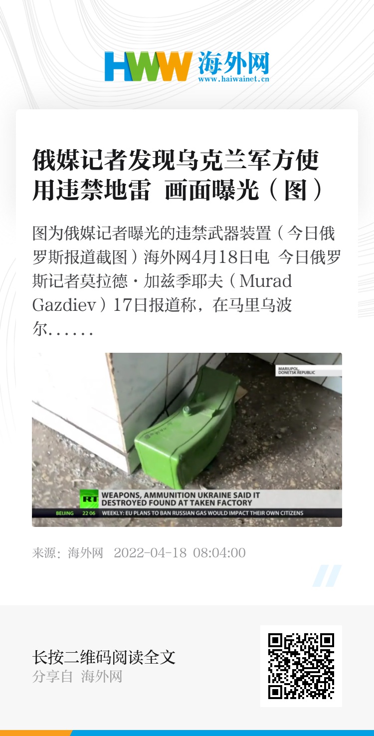 海外网4月18日电 今日俄罗斯记者莫拉德·加兹季耶夫(Murad Gazdiev)17日报道称,在马里乌波尔发现乌克兰军队使用的违禁武器,此类武器被《渥太华禁雷公约》明令禁止。