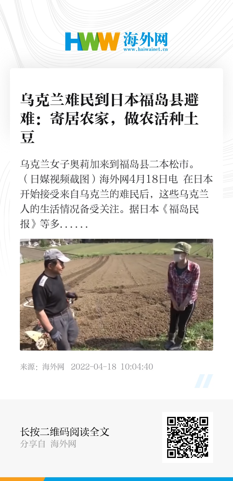 海外网4月18日电 在日本开始接受来自乌克兰的难民后,这些乌克兰人的生活情况备受关注。据日本《福岛民报》等多家媒体17日报道,其中一名女性前往福岛县避难,在当地一户农家居住并一起做农活种土豆。