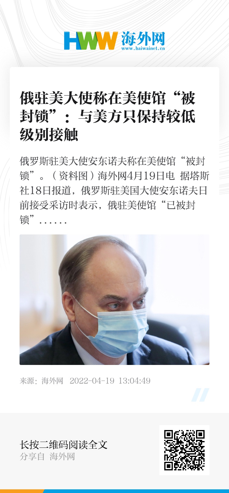 海外网4月19日电 据塔斯社18日报道,俄罗斯驻美国大使安东诺夫日前接受采访时表示,俄驻美使馆“已被封锁”,使馆与美国政府间只保持着“技术性”或较低级别的接触。
