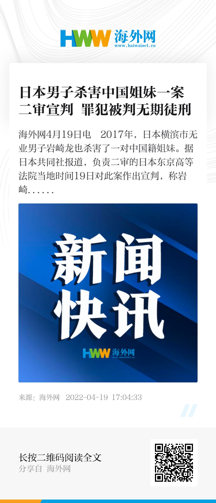 海外网4月19日电 2017年,日本横滨市无业男子岩崎龙也杀害了一对中国籍姐妹。据日本共同社报道,负责二审的日本东京高等法院当地时间19日对此案作出宣判,称岩崎龙杀人罪名成立,判处其无期徒刑。