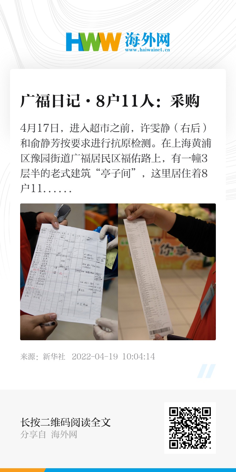 4月17日,广福居委会工作人员许雯静、陈艳、俞静芳带着需求清单,骑着电动车,前往附近的一家大型超市帮居民采购。结束后,她们如“蚂蚁搬家”,多趟来回,运至居委会。再按家庭细分,分装好并贴上明细清单,一户户送给居民。