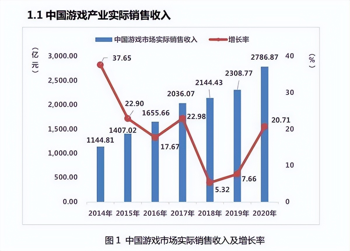 2020年新冠肺炎疫情暴发后,“宅经济”的直接刺激为游戏行业带来了大幅成长。根据中国音数协游戏工委、中国游戏产业研究院发布的《2020年中国游戏产业报告》显示,2020年中国游戏市场实际销售收入 2786.87 亿元,同比增长 20.71%。