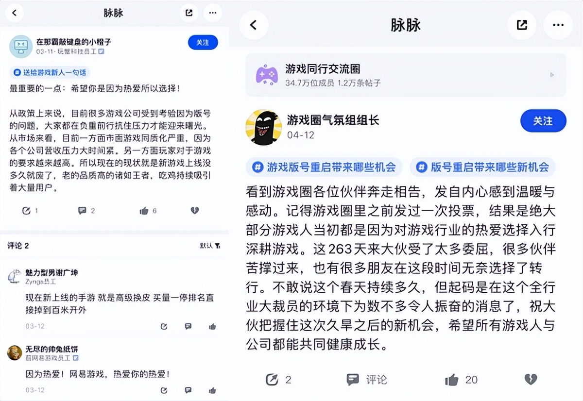 一位脉脉游戏圈的网友在此次版号重启后提到,游戏圈里曾经发起过一次投票,大家为什么选择游戏行业,“结果是绝大部分游戏人当初都是因为对游戏行业的热爱,选择入行深耕游戏”。