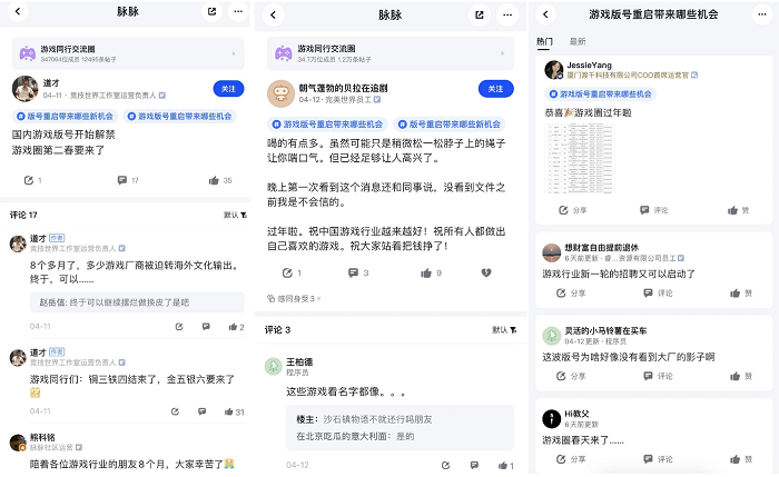 “国内游戏版号开始解禁,游戏圈第二春要来了!”游戏版号恢复的消息让行业如同久旱逢甘霖。在4月11日当日,脉脉游戏圈就开启了线上狂欢。