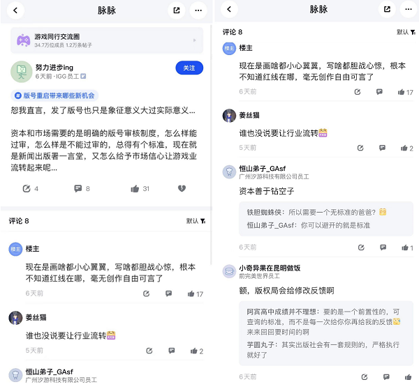 也有IGG认证员工指出,版号发放的象征意义大过实际意义,资本和市场需要明确的版号审核制度,“现在是画啥都小心翼翼”,希望能给予市场信心让游戏业流转起来。