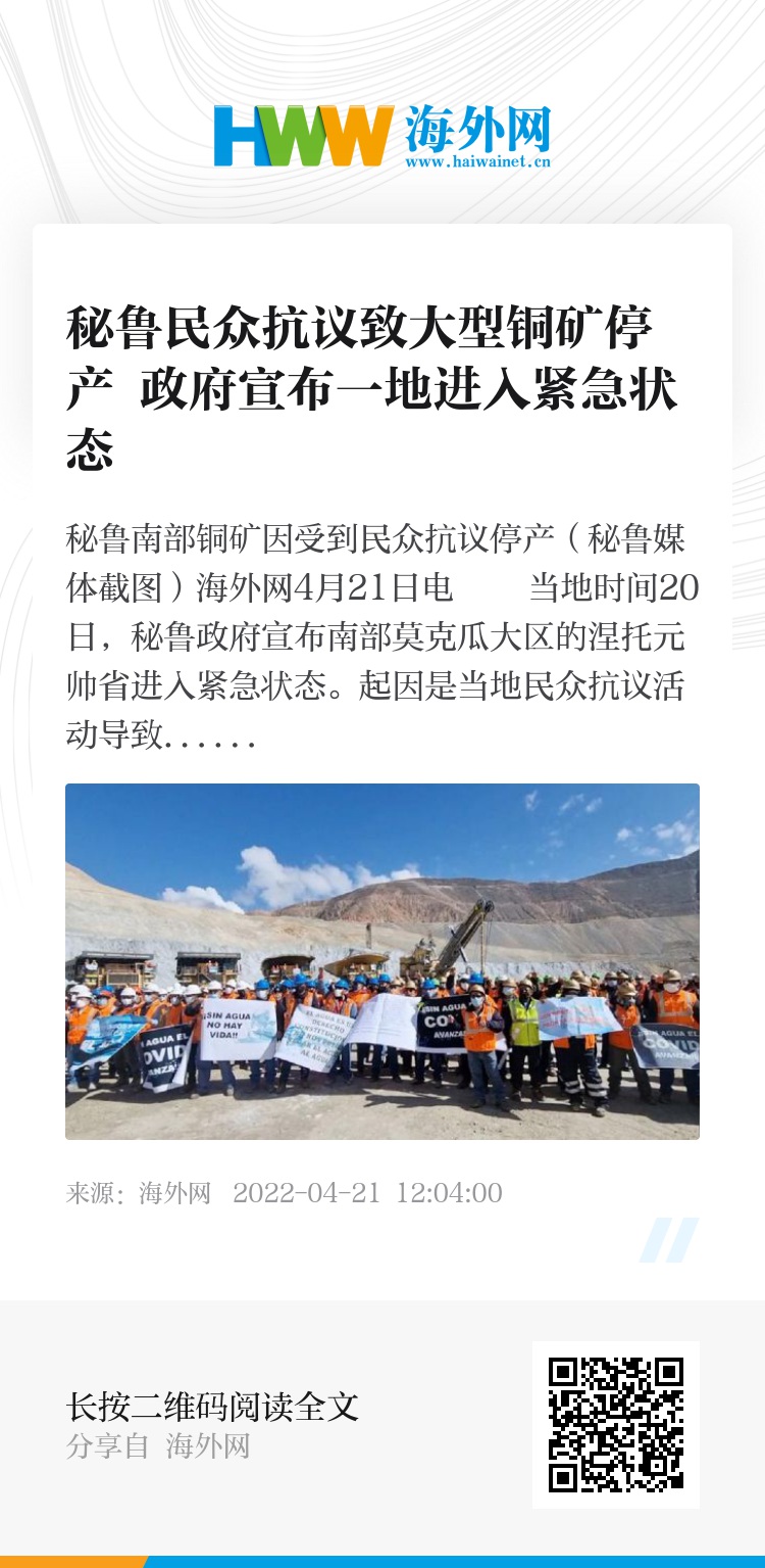海外网4月21日电 当地时间20日,秘鲁政府宣布南部莫克瓜大区的涅托元帅省进入紧急状态。起因是当地民众抗议活动导致铜矿停产,政府未能与当地居民谈拢,最终决定采取紧急状态令以恢复矿业生产。目前秘鲁国内已有2家大型铜矿陷入停产,铜产量占全球铜供应量的2%以上。