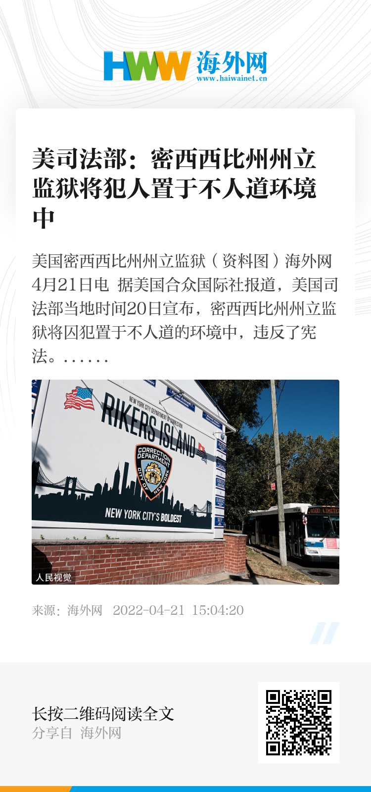 海外网4月21日电 据美国合众国际社报道,美国司法部当地时间20日宣布,密西西比州州立监狱将囚犯置于不人道的环境中,违反了宪法。