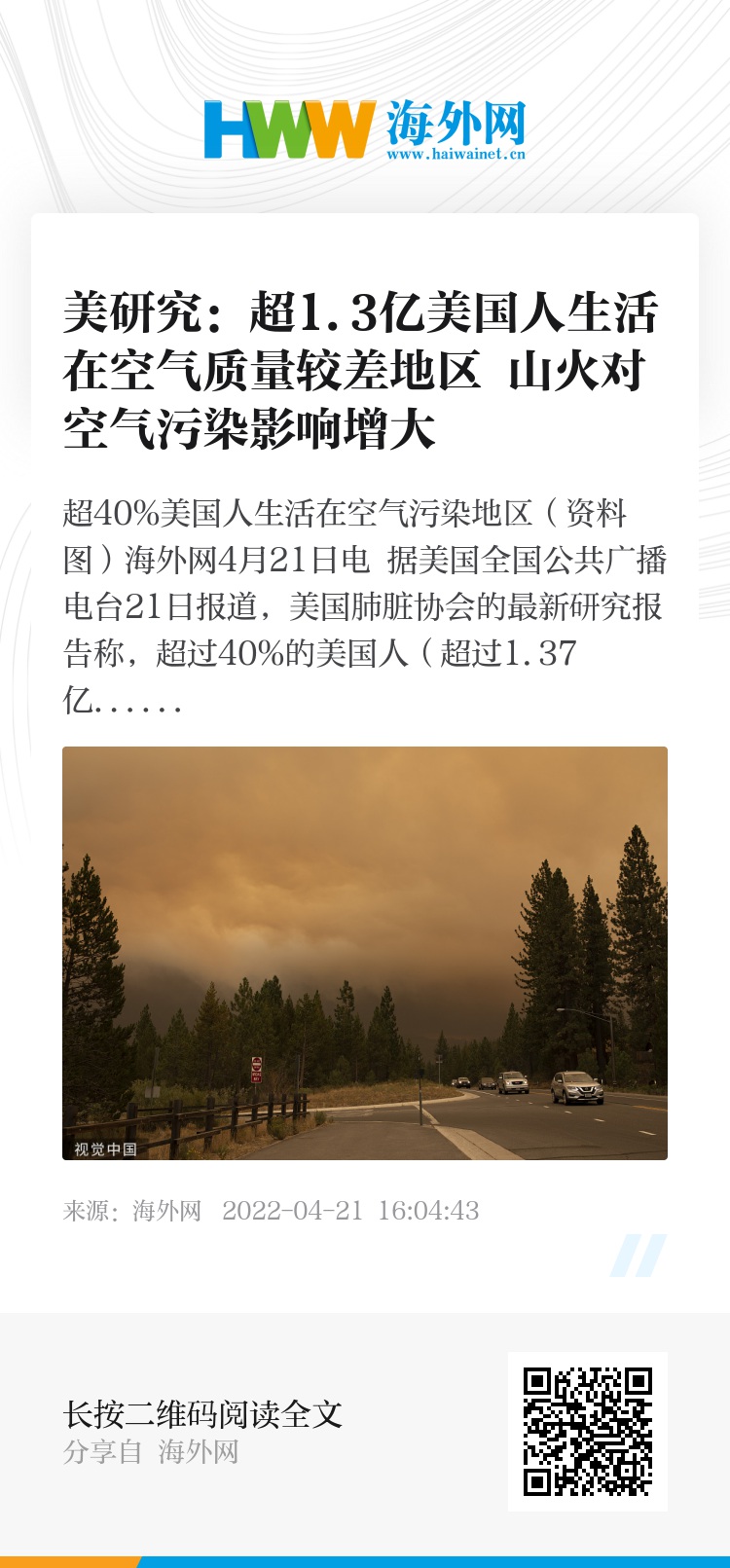 海外网4月21日电 据美国全国公共广播电台21日报道,美国肺脏协会的最新研究报告称,超过40%的美国人(超过1.37亿人)生活在空气质量较差的地区。除了汽车和工厂,山火对空气污染的影响越来越大。