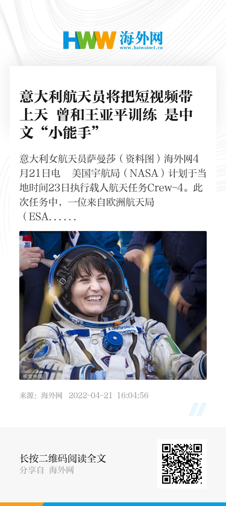 海外网4月21日电 美国宇航局(NASA)计划于当地时间23日执行载人航天任务Crew-4。此次任务中,一位来自欧洲航天局(ESA)的意大利女航天员萨曼莎·克里斯托弗雷蒂(Samantha Cristoforetti)将用TikTok短视频记录太空生活。