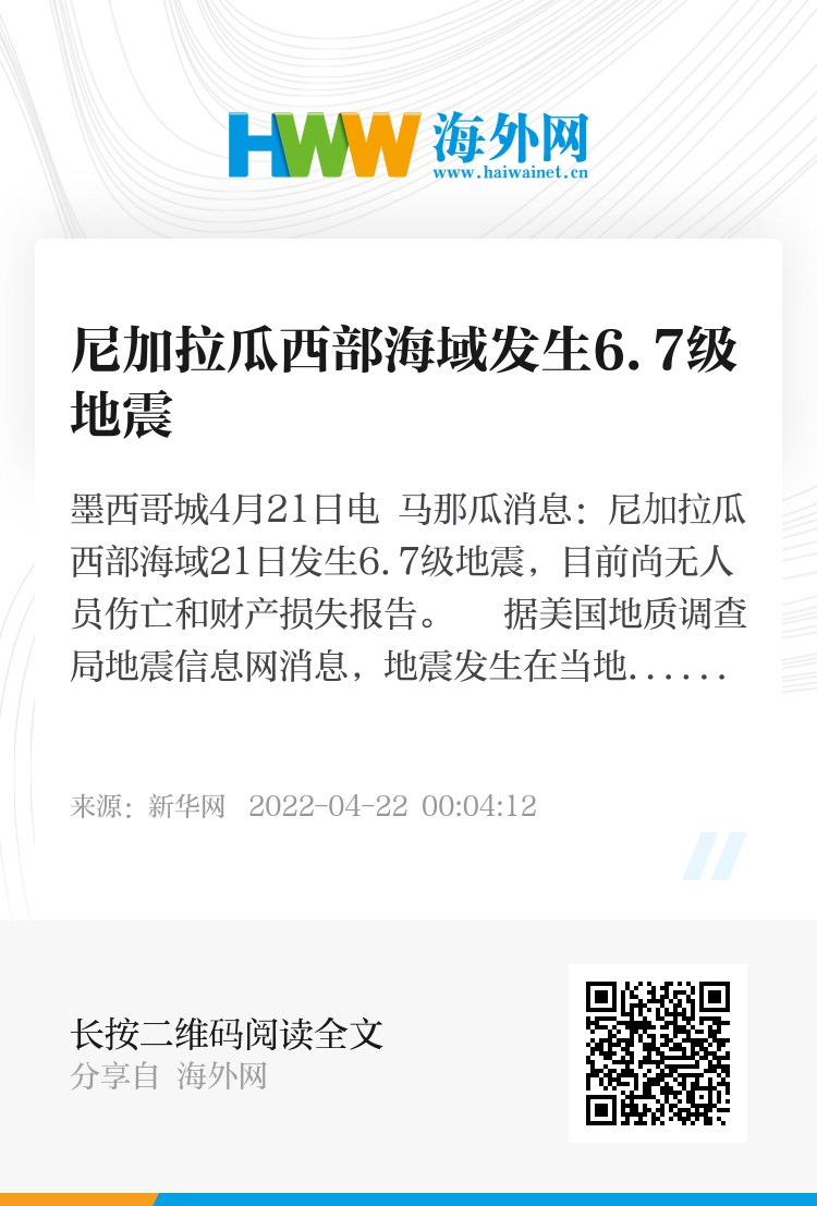 新华社墨西哥城4月21日电 马那瓜消息:尼加拉瓜西部海域21日发生6.7级地震,目前尚无人员伤亡和财产损失报告。