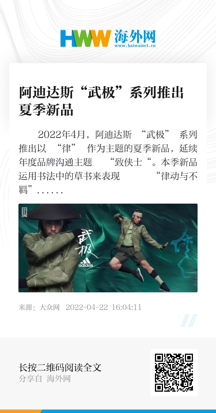 2022年4月,阿迪达斯 “武极” 系列推出以 “律” 作为主题的夏季新品,延续年度品牌沟通主题 “致侠士“。本季新品运用书法中的草书来表现 “律动与不羁”,透气泡泡纱材质搭配武侠风设计,致敬“原则不移,初心不改”的侠士特质。