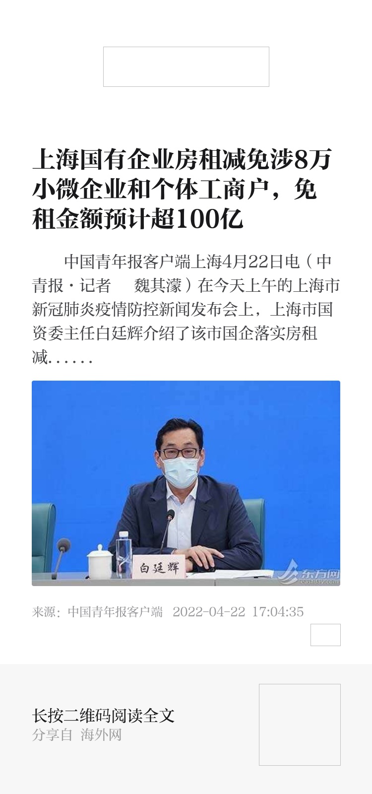中国青年报客户端上海4月22日电(中青报·中青网记者 魏其濛)在今天上午的上海市新冠肺炎疫情防控新闻发布会上,上海市国资委主任白廷辉介绍了该市国企落实房租减免工作的情况。