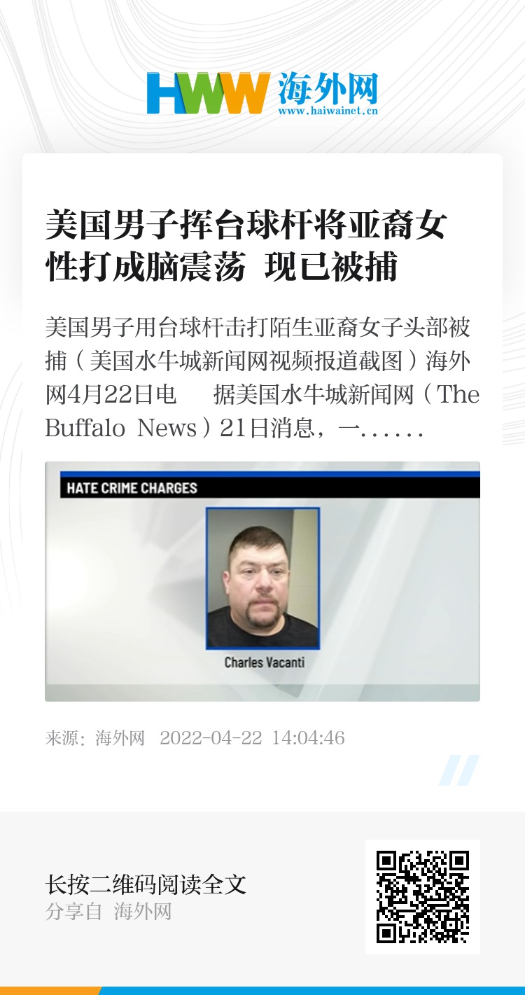 海外网4月22日电 据美国水牛城新闻网(The Buffalo News)21日消息,一名美国男子日前在内布拉斯加州格兰德艾兰市对一名素不相识的亚裔女子进行种族辱骂,随后用台球杆击打女子头部,致其脑震荡及淤伤。