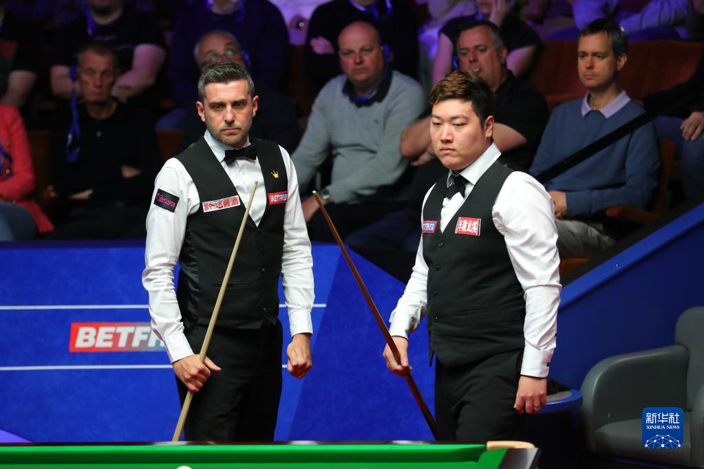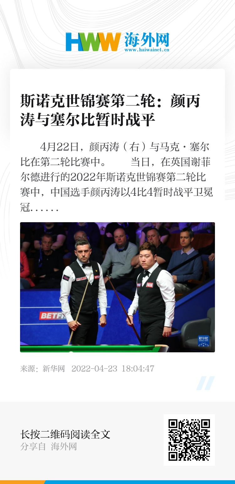 当日,在英国谢菲尔德进行的2022年斯诺克世锦赛第二轮比赛中,中国选手颜丙涛以4比4暂时战平卫冕冠军、英格兰选手马克·塞尔比。