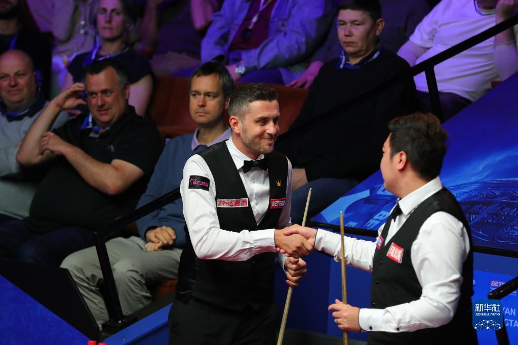 4月22日,颜丙涛(右)与马克·塞尔比在第二轮比赛中。