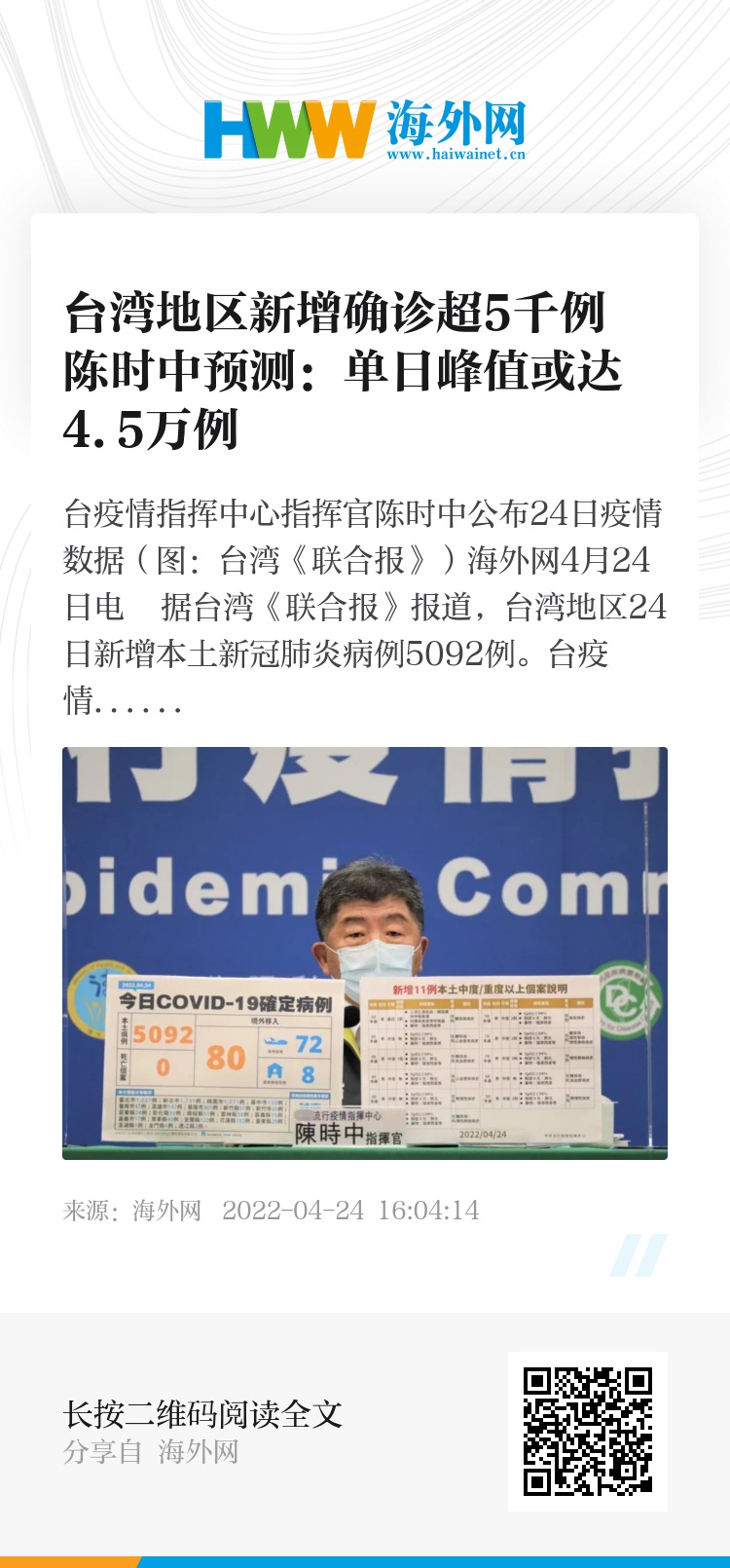 海外网4月24日电 据台湾《联合报》报道,台湾地区24日新增本土新冠肺炎病例5092例。台疫情指挥中心指挥官陈时中称,确诊病例一定会上升,并预测单日确诊病例最高点或达4.5万例。
