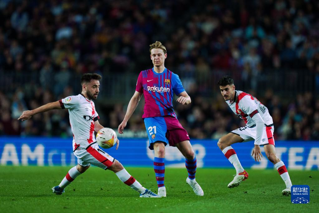 4月24日,巴塞罗那队球员弗朗基·德容(中)与巴列卡诺队球员安德烈斯·马丁(左)和奥斯卡·瓦伦丁在比赛中拼抢。新华社发(胡安·戈萨摄)