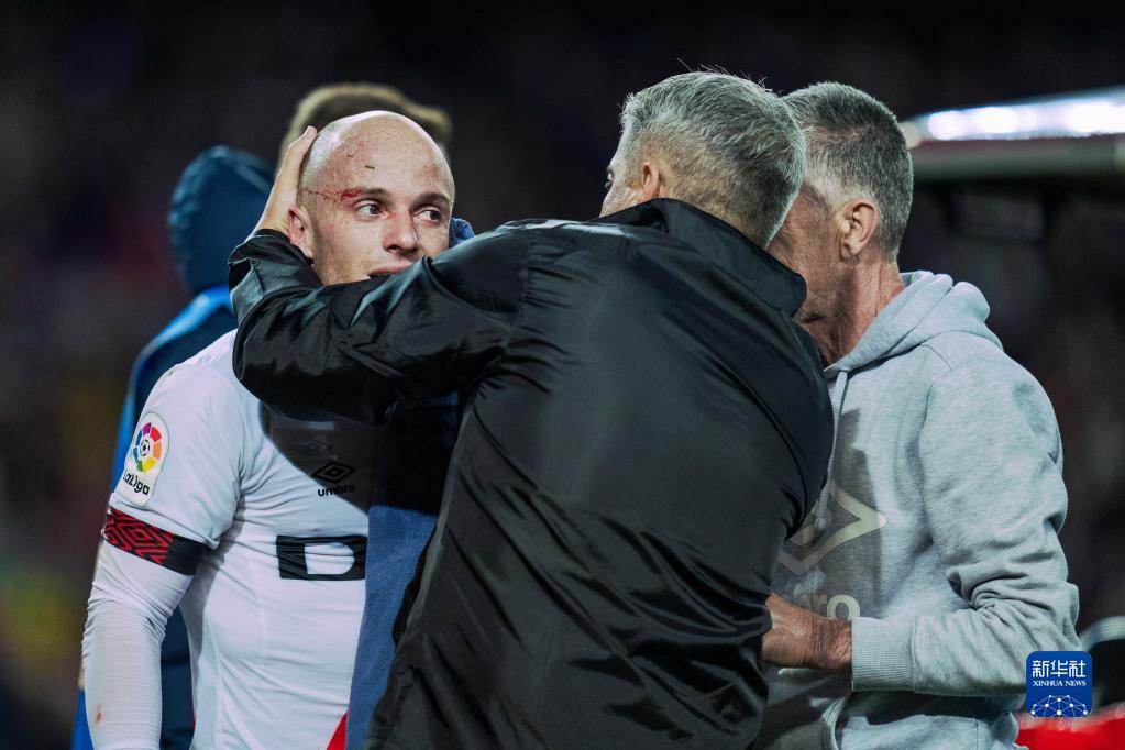 4月24日,巴列卡诺队球员佩拉松(左)在比赛中受伤。新华社发(胡安·戈萨摄)