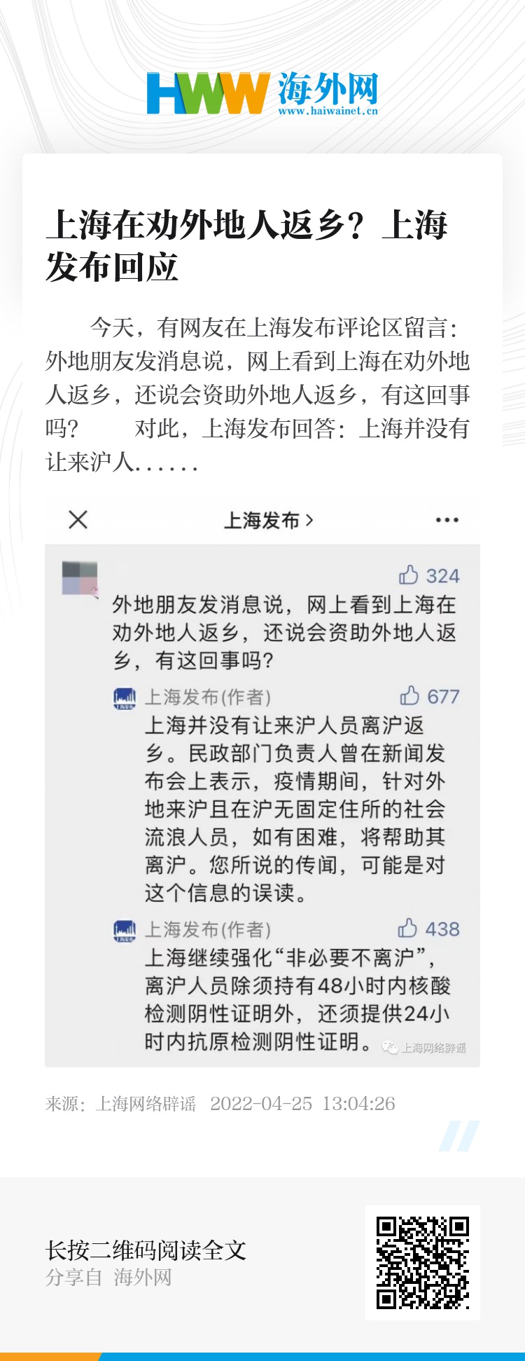 对此,上海发布回答:上海并没有让来沪人员离沪返乡。民政部门负责人曾在新闻发布会上表示,疫情期间,针对外地来沪且在沪无固定住所的社会流浪人员,如有困难,将帮助其离沪。您所说的传闻,可能是对这个信息的误读。上海继续强化“非必要不离沪”,离沪人员除须持有48小时内核酸检测阴性证明外,还须提供24小时内抗原检测阴性证明。
