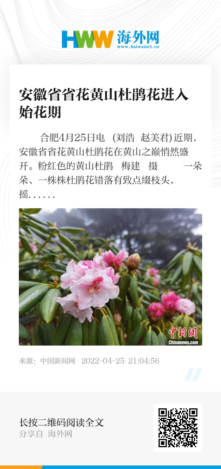 中新网合肥4月25日电 (刘浩 赵美君)近期,安徽省省花黄山杜鹃花在黄山之巅悄然盛开。