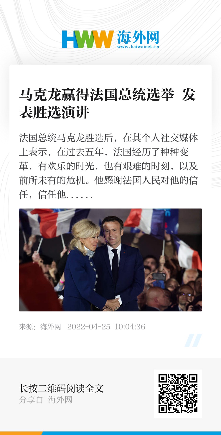 32400744,.马克龙赢得法国总统选举 发表胜选演讲,.2022-04-25 10:19:36,.103712,.夏丽娟、张青津