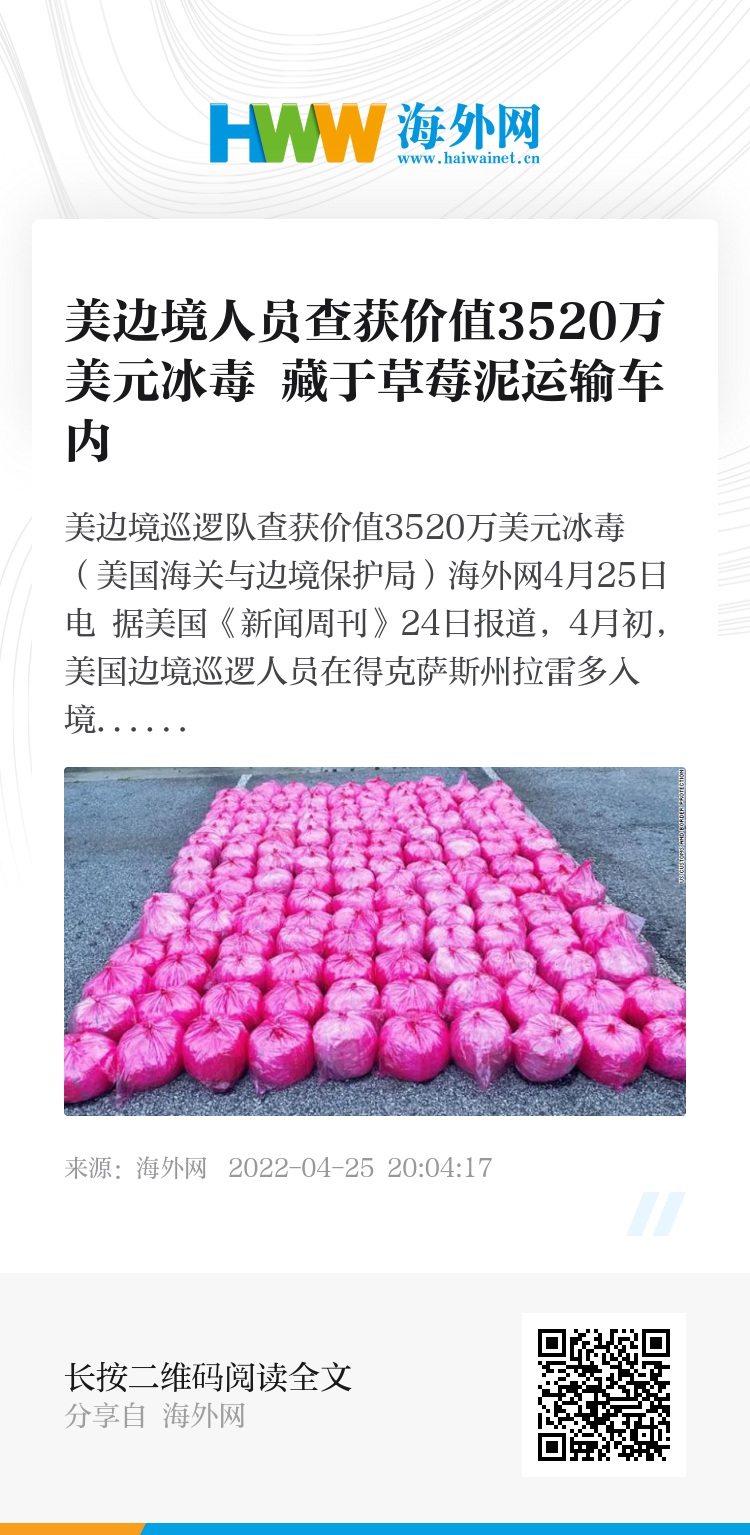 海外网4月25日电 据美国《新闻周刊》24日报道,4月初,美国边境巡逻人员在得克萨斯州拉雷多入境口岸对一辆商用卡车进行检查时,发现车上不止装运了草莓泥,还有价值超过3500万美元的甲基苯丙胺,即冰毒。拉雷多口岸官员阿尔伯特·弗洛雷斯称:“这次查获了大量甲基苯丙胺,我们目前在入境口岸面临着毒品威胁。”
