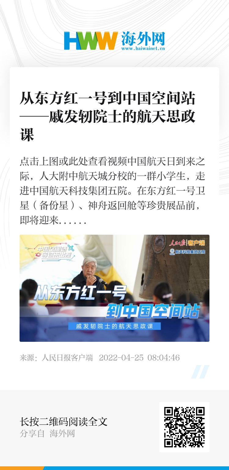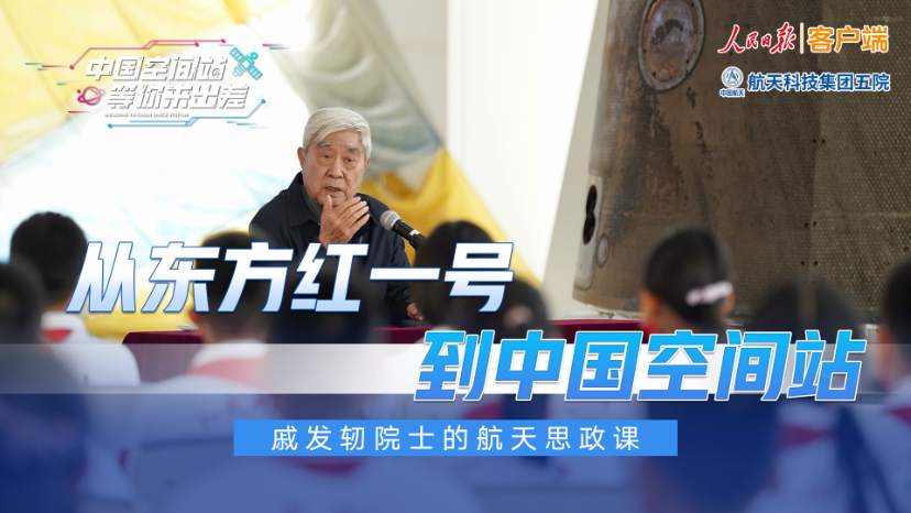 中国航天日到来之际,人大附中航天城分校的一群小学生,走进中国航天科技集团五院。在东方红一号卫星(备份星)、神舟返回舱等珍贵展品前,即将迎来89岁生日的神舟飞船首任总设计师、中国工程院院士戚发轫,为他们讲了一堂生动的航天思政课,讲述中国航天故事、传承航天精神。